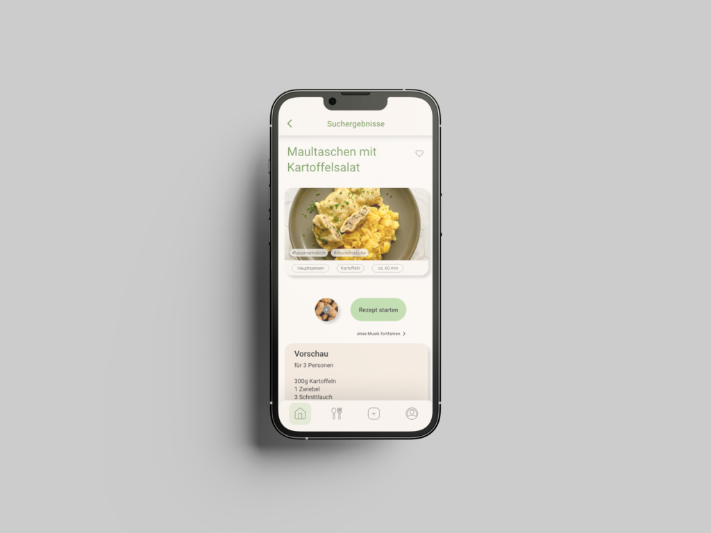Unsere Aufgabe bestand darin, eine Koch-App zu entwerfen, die sich gezielt an die Bedürfnisse einer definierten Nutzergruppe anpasst. Dafür entwickelten wir zunächst eine Persona, basierend auf einem realistischen Szenario. Diese Persona half uns, die Anforderungen, Erwartungen und Nutzungskontexte besser zu verstehen und gezielt in das App-Design einfließen zu lassen.